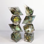 This listing is for an 8 piece polyhedral dice set consisting of, D20 with logo, D20, Rhombic D12, D%, D10, D8, D6 with logo and D4 shard.