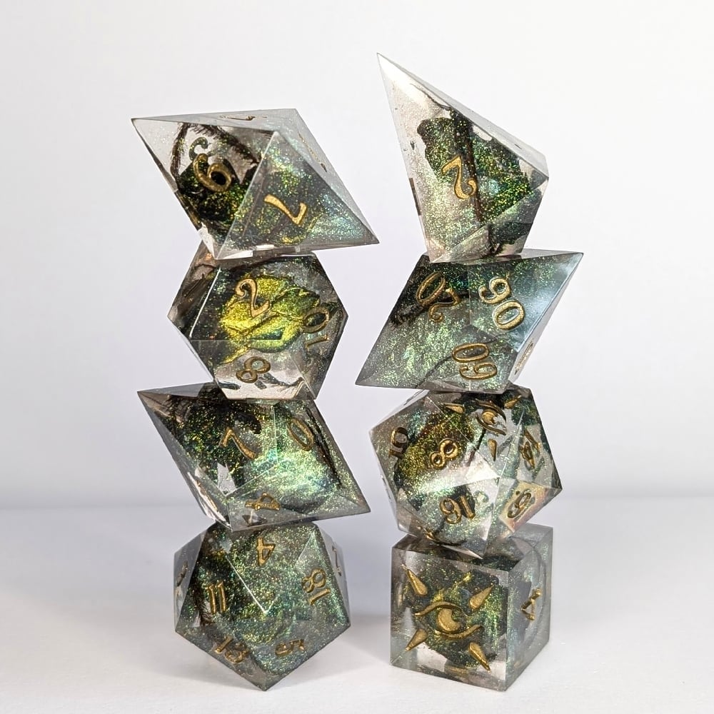 Containing ethically sourced snake shed and peacock feathers, these shimmering dice would be a great addition to any trove!