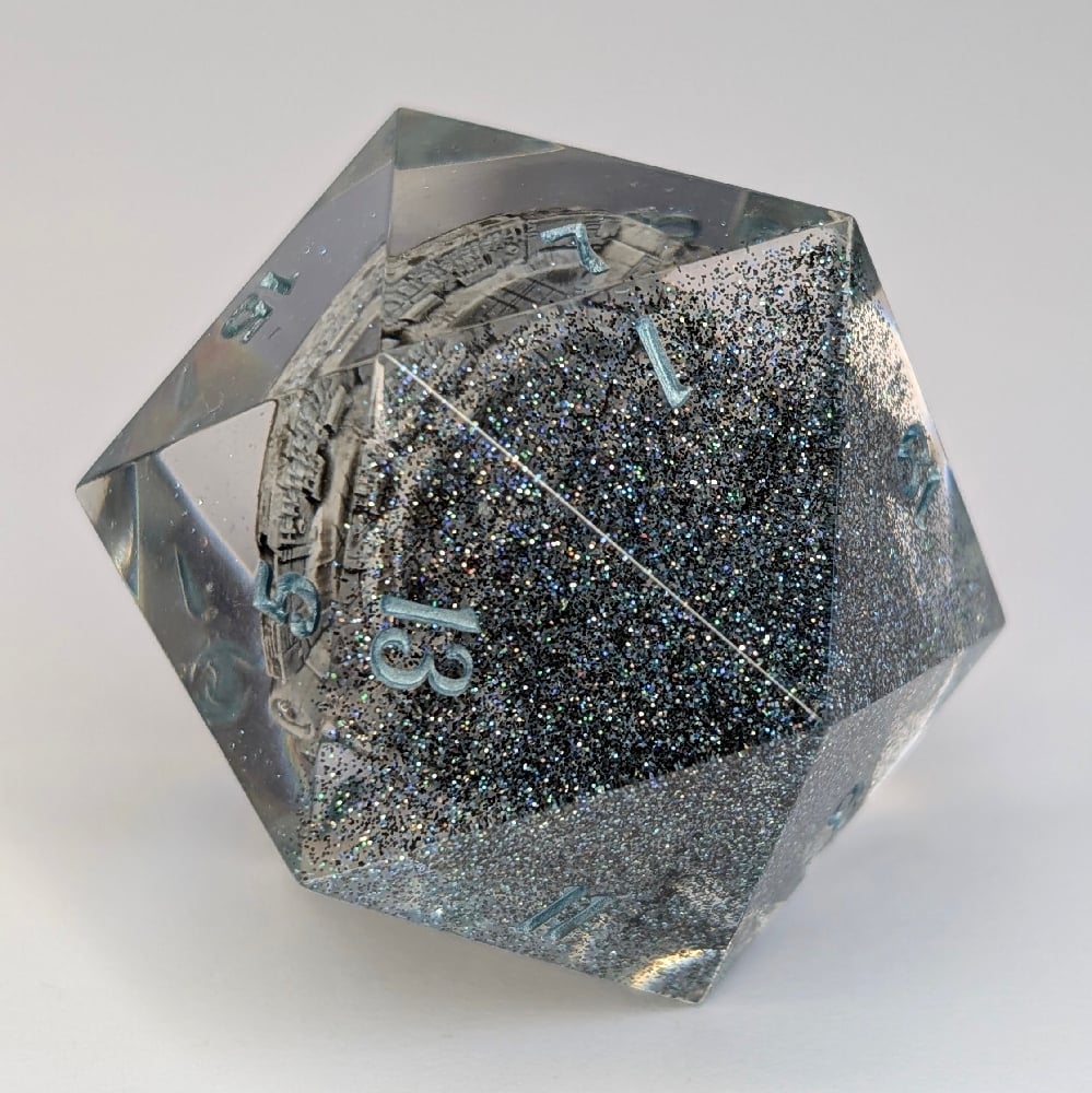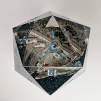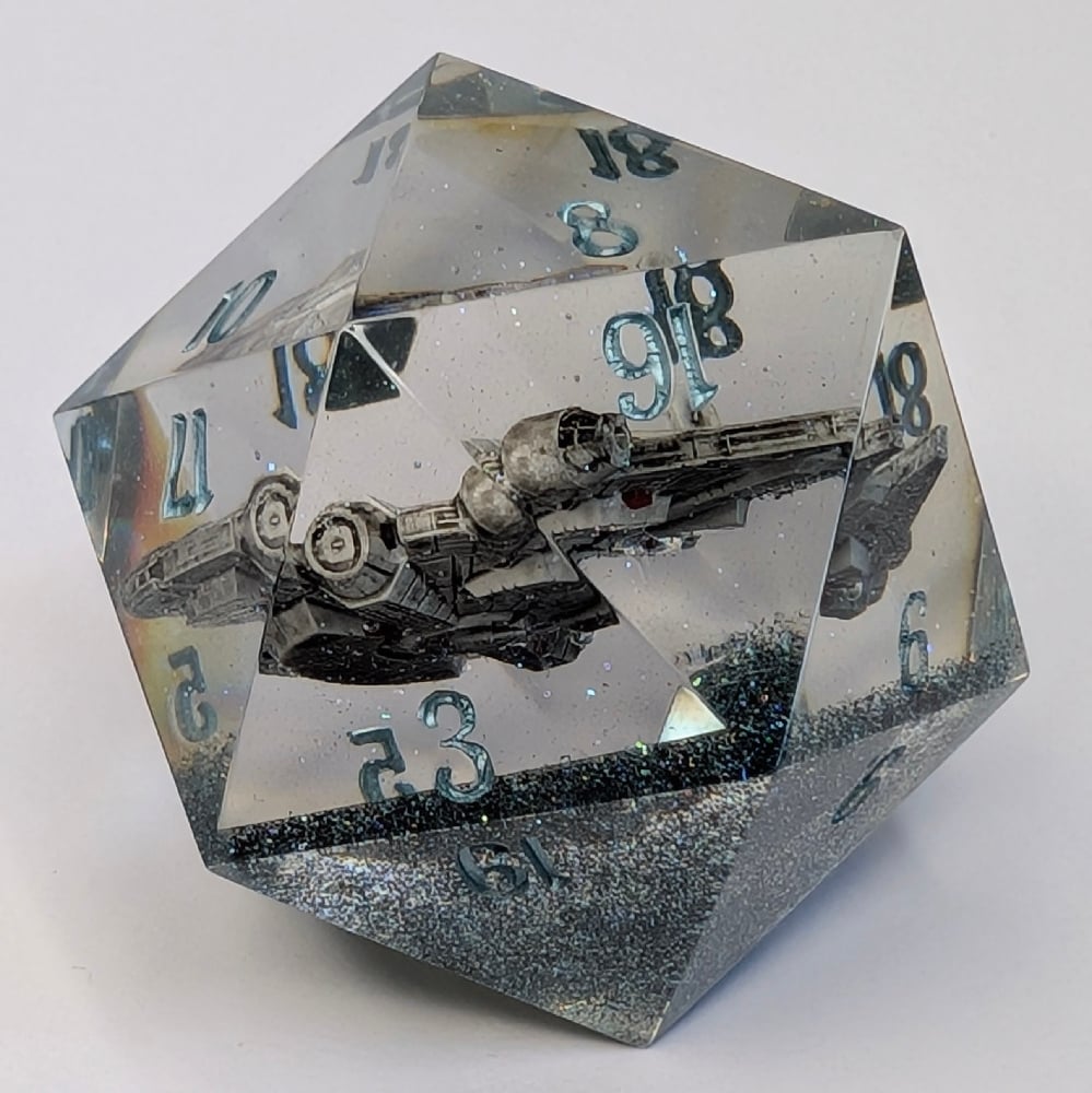 The Millennium Falcon. What more can I say? 3d printed, hand-painted and suspended over a sparkling blue base of this 40mm D20 Chonk.